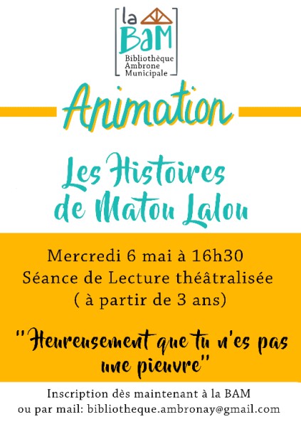 Bibliothèque municipale d'AmbronayAgenda des animations06/05/2026 à 16:3006/05/2026 à 17:30Étiquette: Contes